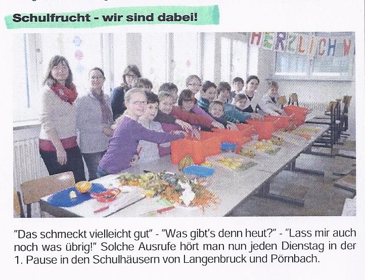 Auch in der Grundschule Langenbruck/Pörnbach erhalten die Schüler/innen 1 x wöchentlich von uns als Schulfruchtlieferant geliefert, und Dank der engagierten Eltern die die Zubereitung der Früchte übernommen haben, leckeres Obst und Gemüse aus ökologischer Erzeugung.